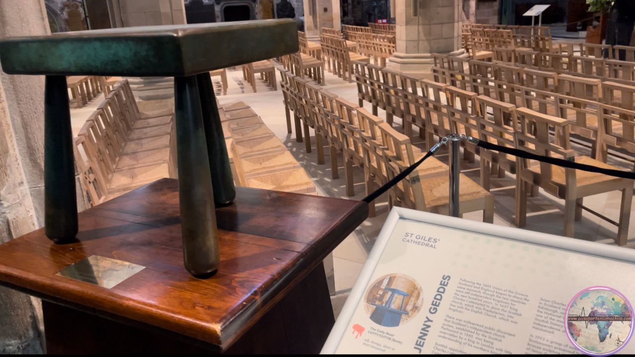 En la Catedral alberga el taburete que Jenny Geddes (comerciante escocesa que supuestamente arrojó un taburete a la cabeza del ministro en la catedral de St Giles en objeción al primer uso público del Versión revisada del Libro de Oración Común de la Iglesia de Escocia , el Libro de Oración Escocés de 1637 . Se dice que el acto provocó los disturbios que condujeron a las Guerras de los Tres Reinos , que incluyeron la Guerra Civil Inglesa .